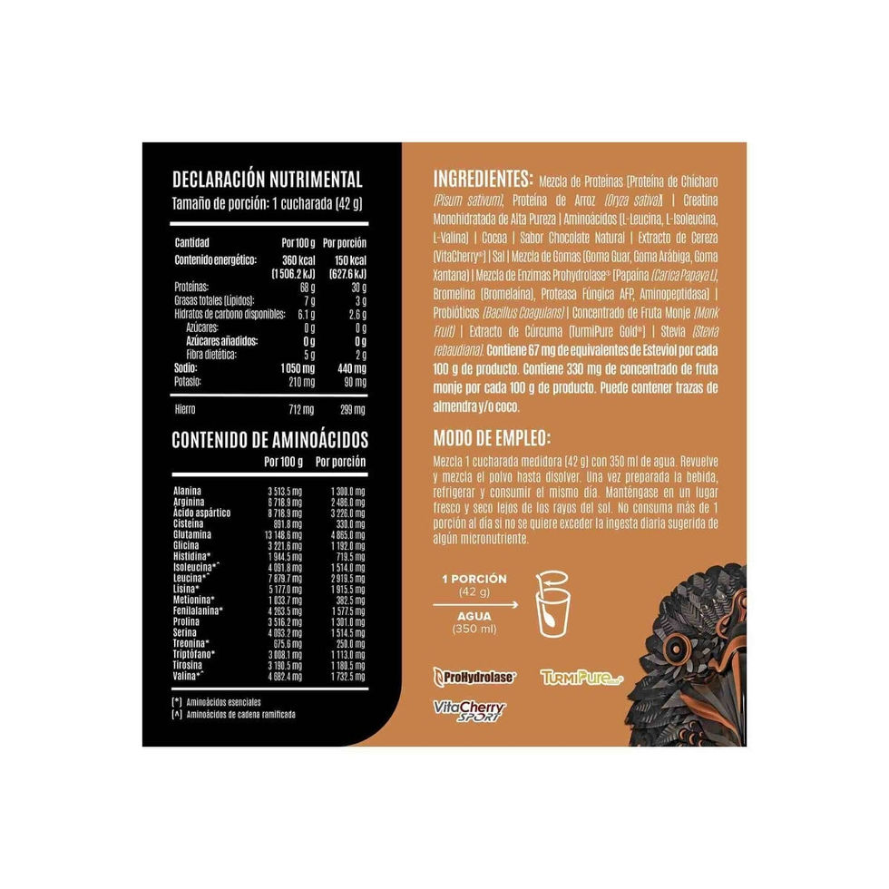Mezcla de proteínas (proteína de chícharo, proteína de arroz, proteína de semilla de arándano),Creatina mono-hidratada (Creapure), Aminoácidos [l-leucina, L- isoleucina, L-valina), Probióticos (bacillus coagulans).