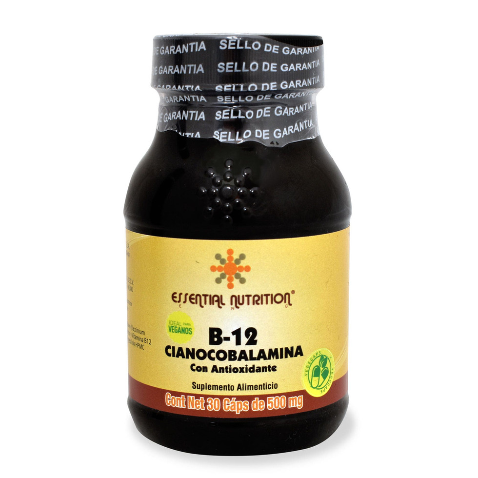 La Vitamina B12 de Essential Nutrition en presentación de 30 cápsulas, con una concentración de 12 mcg por cápsula, es un suplemento alimenticio diseñado para mantener la salud del sistema nervioso, la producción de glóbulos rojos y el metabolismo energético.