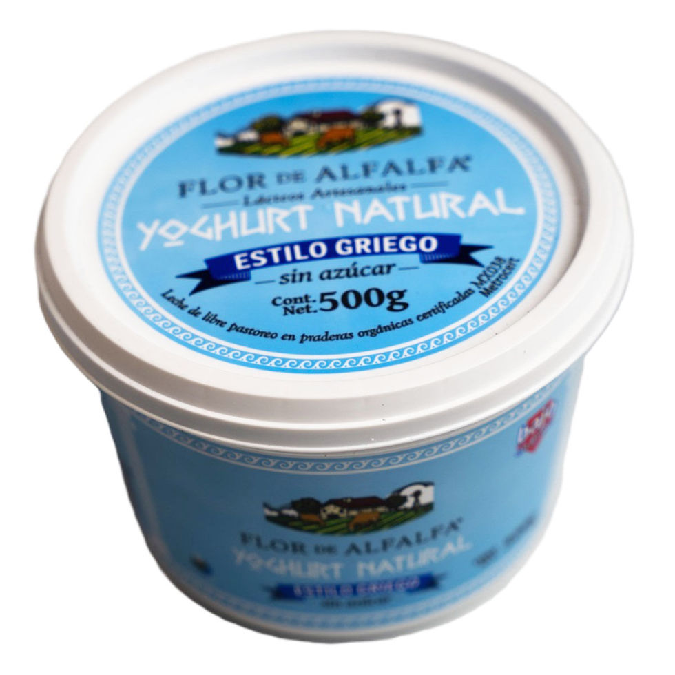Yoghurt Griego Flor Alfalfa natural sin filtrar es el resultado de fermentar la leche con cultivos lácticos directamente en el envase, dando como resultado una consistencia de flan.